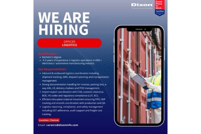 March 19, 2026Dixon Technologies India Limited is hiring! The company is looking for an Officer – Logistics to manage end to end logistics operations and...