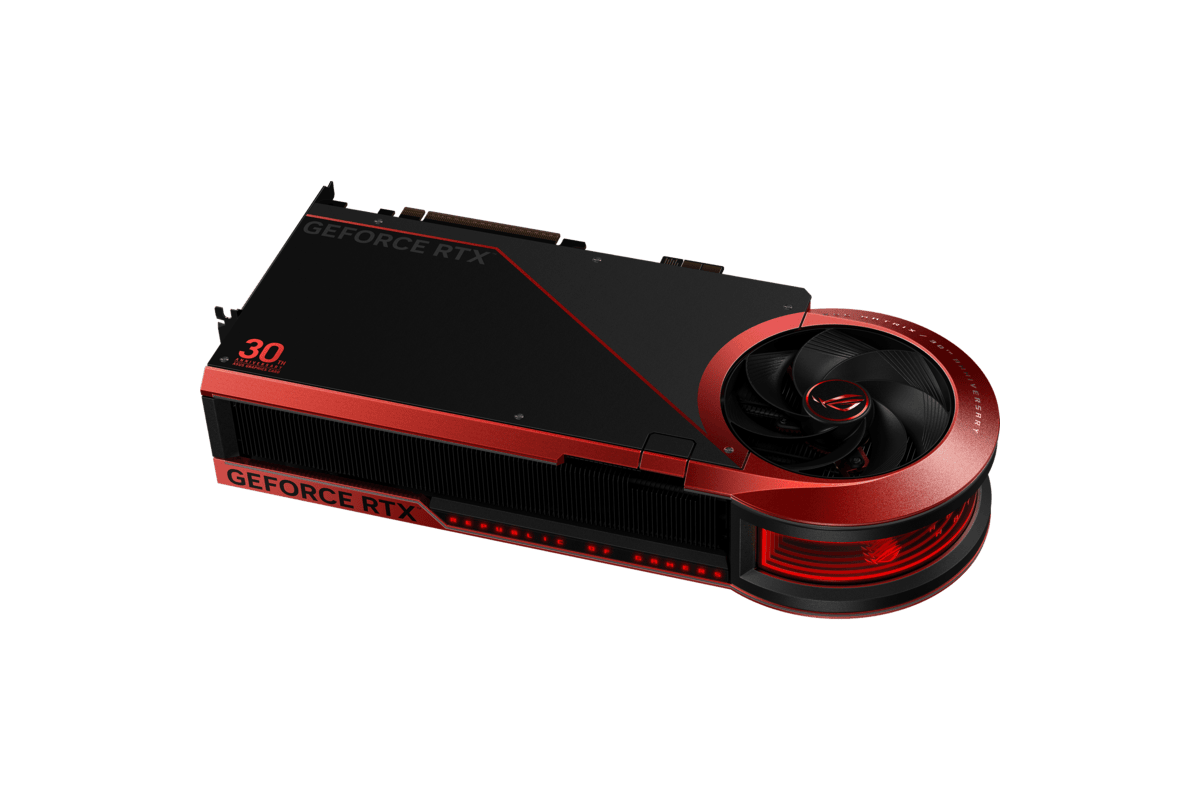 The card builds on past ROG designs, incorporating a hybrid copper-aluminum heatsink, metallic accents and a translucent panel inspired by the infinity mirror lighting seen in earlier models. Its layout includes stacked fans within a circular frame, giving it a distinct appearance whether mounted vertically or horizontally.