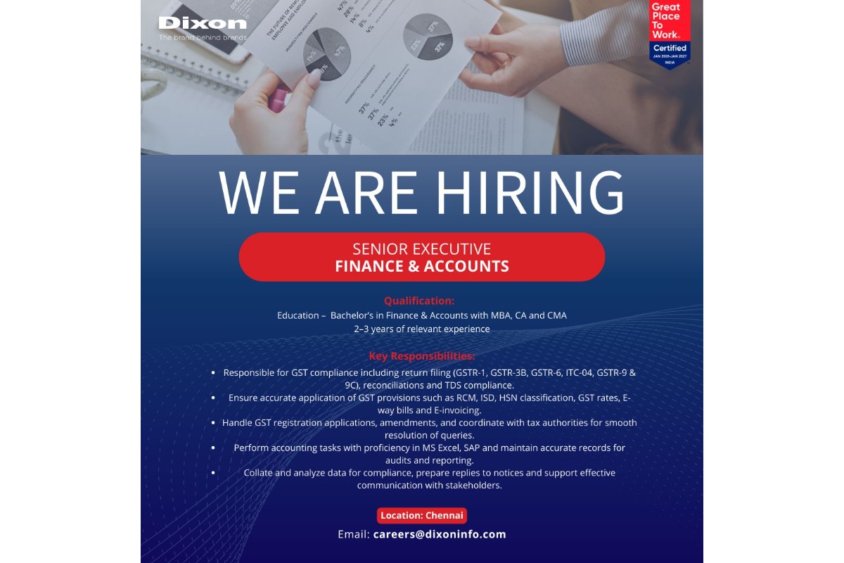 The company is looking for a Senior Executive – Finance & Accounts to support tax compliance and accounting operations. The role focuses on GST and TDS compliance, return filings, reconciliations, SAP based accounting and supporting audits along with regulatory requirements.