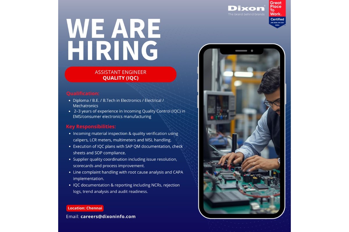 Candidates should have a Diploma, B.E. or B.Tech in Electronics, Electrical or Mechatronics with 2 to 3 years of experience in IQC, preferably in EMS or consumer electronics manufacturing.