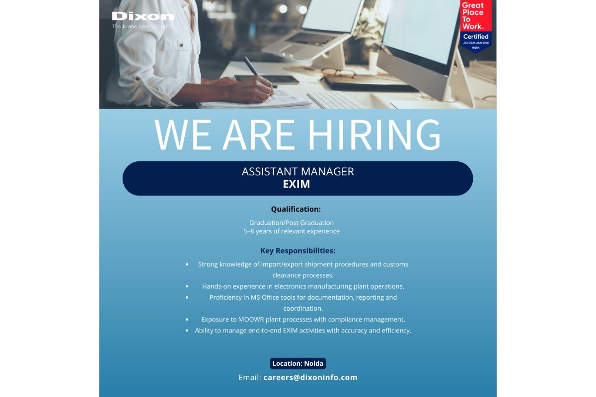 The company is looking for an Assistant Manager – EXIM to join its team in Noida. This role is suited for professionals with 5 to 8 years of experience in export and import processes who want to work in a fast paced electronics manufacturing environment.