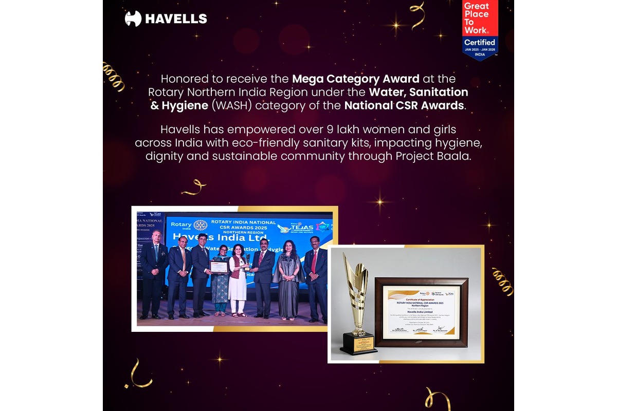Havells India Ltd. received the Mega Category Award in the Rotary Northern India Region under the Water, Sanitation & Hygiene (WASH) category at the National CSR Awards 2025. The recognition highlights Havells’ contribution to social impact through its flagship initiative, Project Baala. So far, it has supported more than 9 lakh women and girls across India. Havells continues to link its CSR activities with broader sustainability goals, working toward cleaner environments and healthier communities.