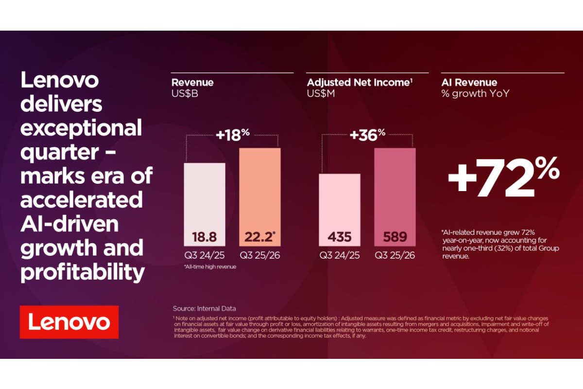 Lenovo reported record revenue of US$22.2 billion for Q3 FY25/26, up 18% year on year. Adjusted net income rose 36% to US$589 million, with margin expanding to 2.7%. Net income stood at US$546 million. AI related revenue grew 72% and now accounts for 32% of total revenue.