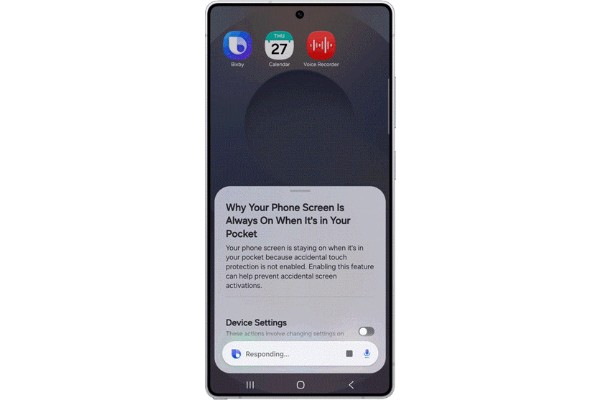 The update enables users to control Galaxy devices using natural language instead of specific commands. Users can describe what they want in their own words and Bixby interprets the intent to adjust settings or explain device behavior. For example, it can activate features like keeping the screen on while viewing or suggest settings such as accidental touch protection based on context.