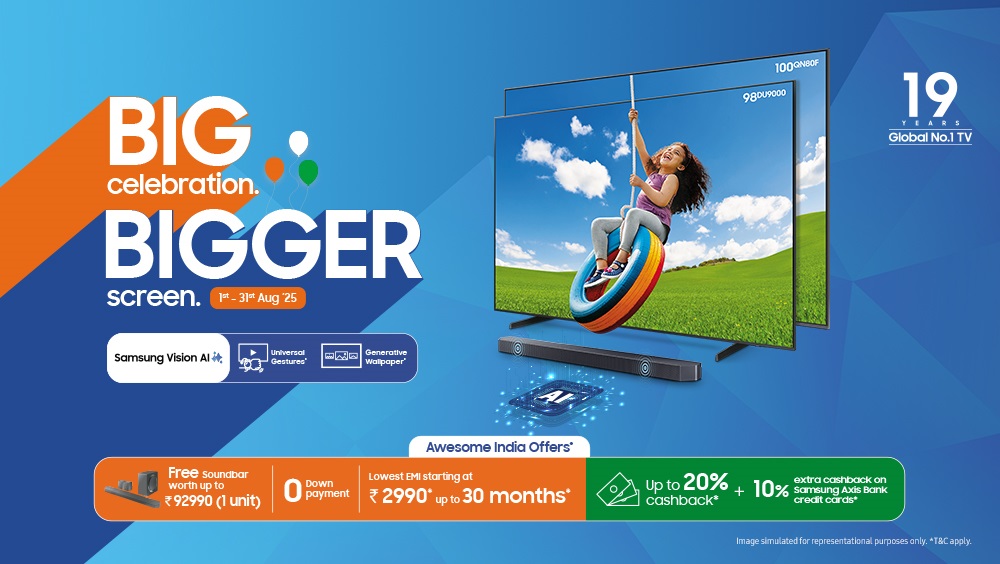 Samsung India has announced its Big Celebration, Bigger Screen campaign to mark Independence Day, running from August 1 to 31, 2025. The offer is available in retail stores and online, encouraging customers to upgrade to larger TVs from Samsung’s Neo QLED, OLED, QLED and Crystal 4K UHD series.